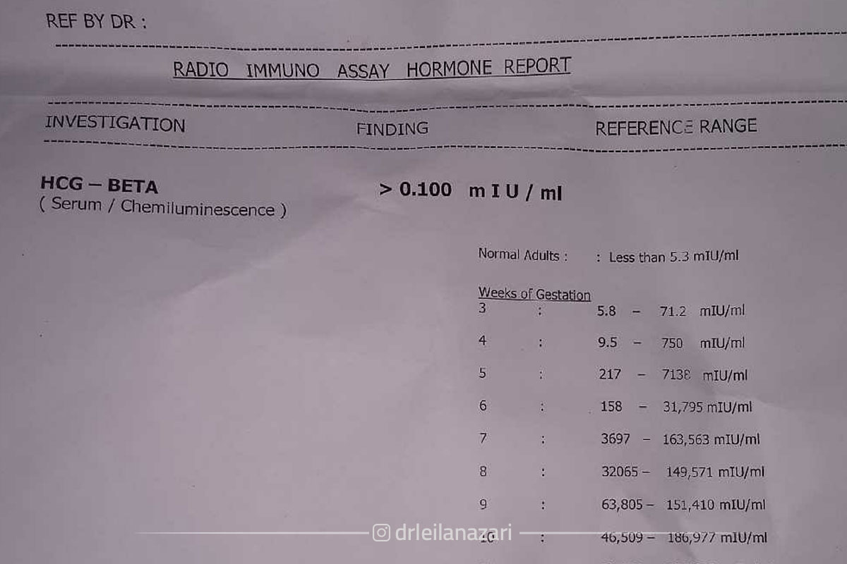 اگر عدد HCG کمتر از ۵ باشد، جواب آزمایش منفی است و اگر بیشتر از ۵ باشد، نتیجه بارداری مثبت است.